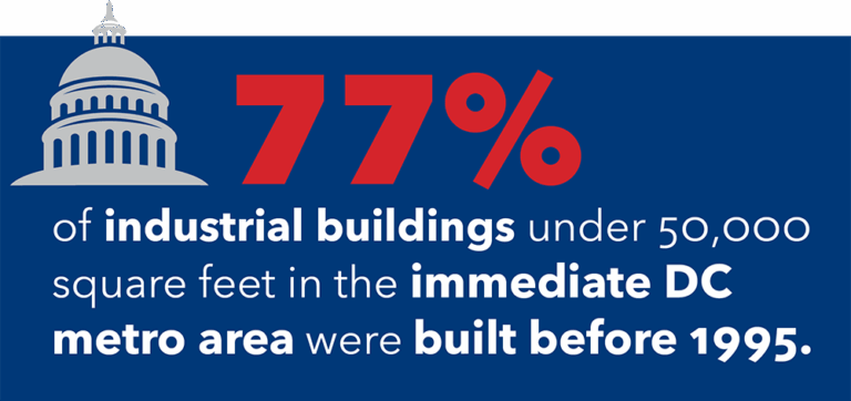 As an illustration, 77% of industrial buildings under 50,000 square feet in the immediate DC metro area were built before 1995. This pattern repeats in established industrial corridors nationwide, where aging buildings present both challenges and opportunities for strategic improvement.